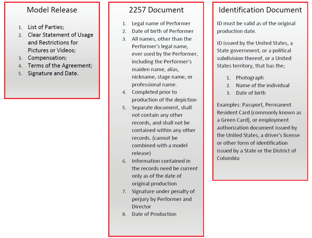 To make 2257 easier for Content Creators to understand I created this illustration. I have listed each document that is needed and the legal requirements for each document. If your documents do not meet every single requirement listed then your docs are either violating the law or not legally valid (Please note that if your model release doesn’t state the compensation, it’s not a valid contract).