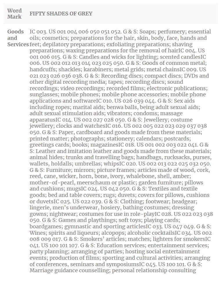 What many Content Creators do not understand is that usually multiple trademarks need to be filed depending on what uses the Content Creator wants to protect. For example, one trademark in Class 41 will not protect that stage name for the use on t-shirts. The manner in which a trademark operates to protect a brand is that a company or Content Creator has to register that trademark for each use that want to protect it for. Quite simply, to protect their stage name on the Internet would be one registration. To protect that same stage name for a line of t-shirts that would be an additional filing. If the Content Creator wanted to protect a wide range of uses many filings would be necessary. For example, the owner of the mark “Fifty Shades of Grey” has filed the following trademarks.